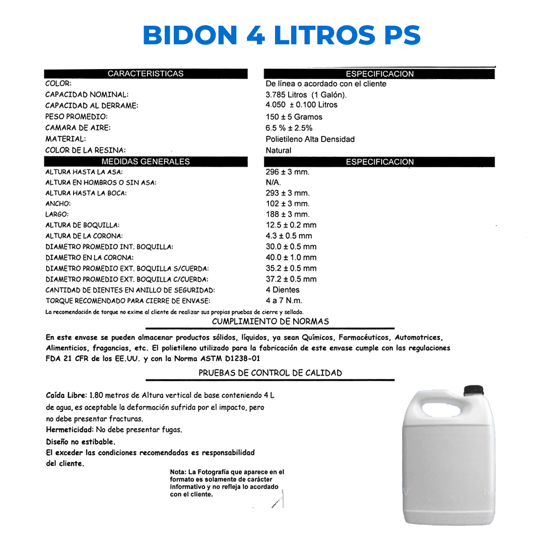 Descripción: Envase de polietileno color natural, Modelo "PS", tapón tipo "I" negro de rosca con arillo poliform y sello de inviolabilidad, no estibable. Capacidad: 4 litros. Peso: 150 grs. Altura: 296 mm. Ancho: 102mm. Largo: 188mm. Diámetro Boquilla: 30mm.