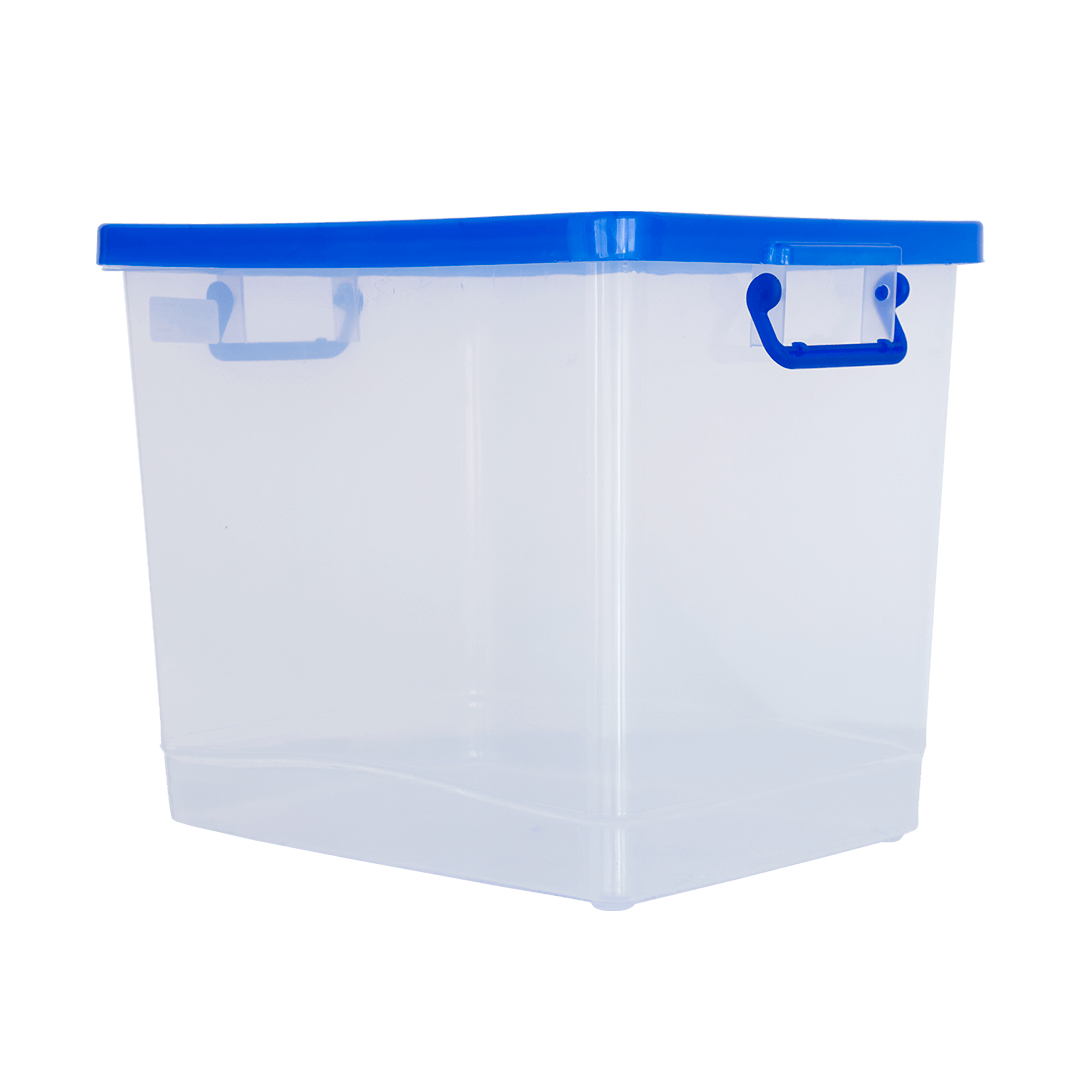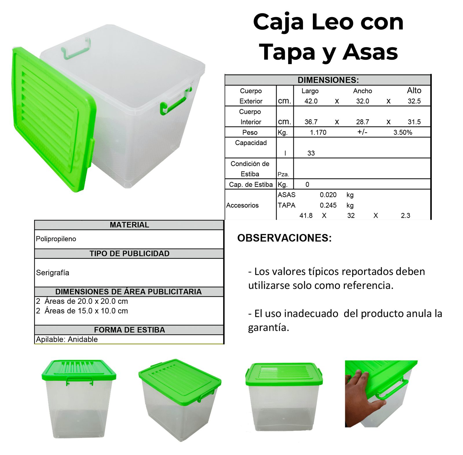 Material: Polipropileno. Medidas: Largo: 41.6 cm. Ancho: 31.8 cm. Alto: 32.9 cm. Peso: 1.170 Kg. Capacidad de Carga: 33 lts. Condiciones de estiba: 4 piezas con producto. Color tapa: Azul. Con tapa y Asas. Minimo de compra: 5 piezas.