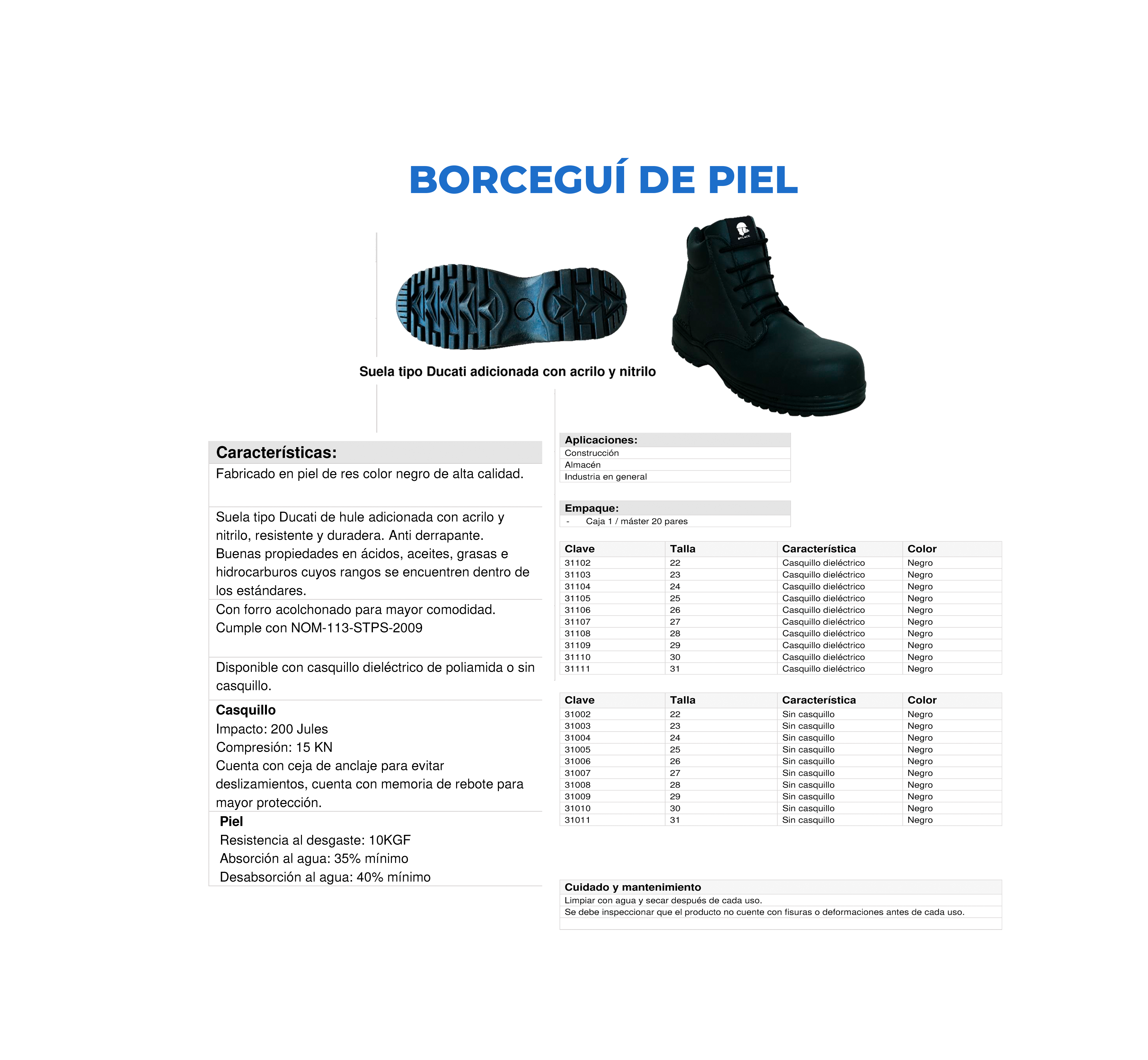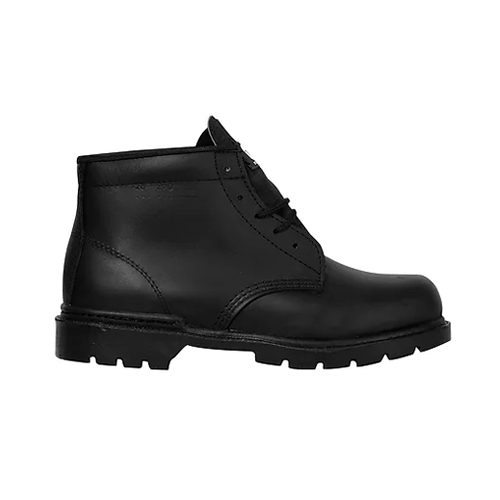 Fabricado en piel de res color negro. Disponible diélectrico. Suela de hule natural alta resistencia al corte y a la abrasión, Grabado antiderrapante en la suela, Amplia protección contra ácidos, solventes y ligera contra grasas y aceites, cómodos y ligeros. Talla: de la 22 a la 31.