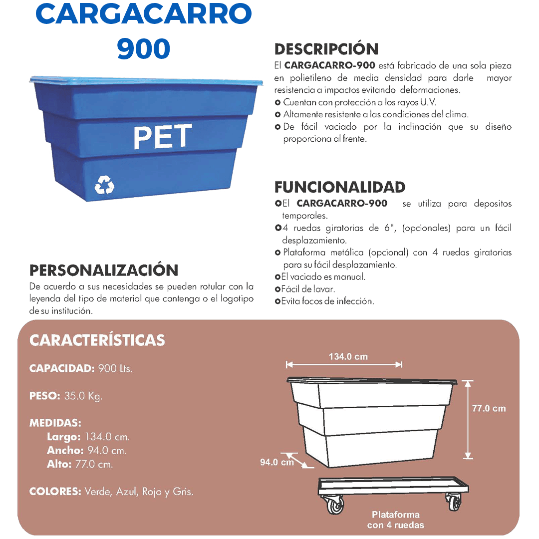 Descripción: Contenedor fabricado en polietileno de media densidad. Capacidad volumen: 900 litros. Color: Gris Claro. Largo: 134.0 cm. Ancho: 94.0 cm. Alto: 77.0 cm. Sin ruedas.