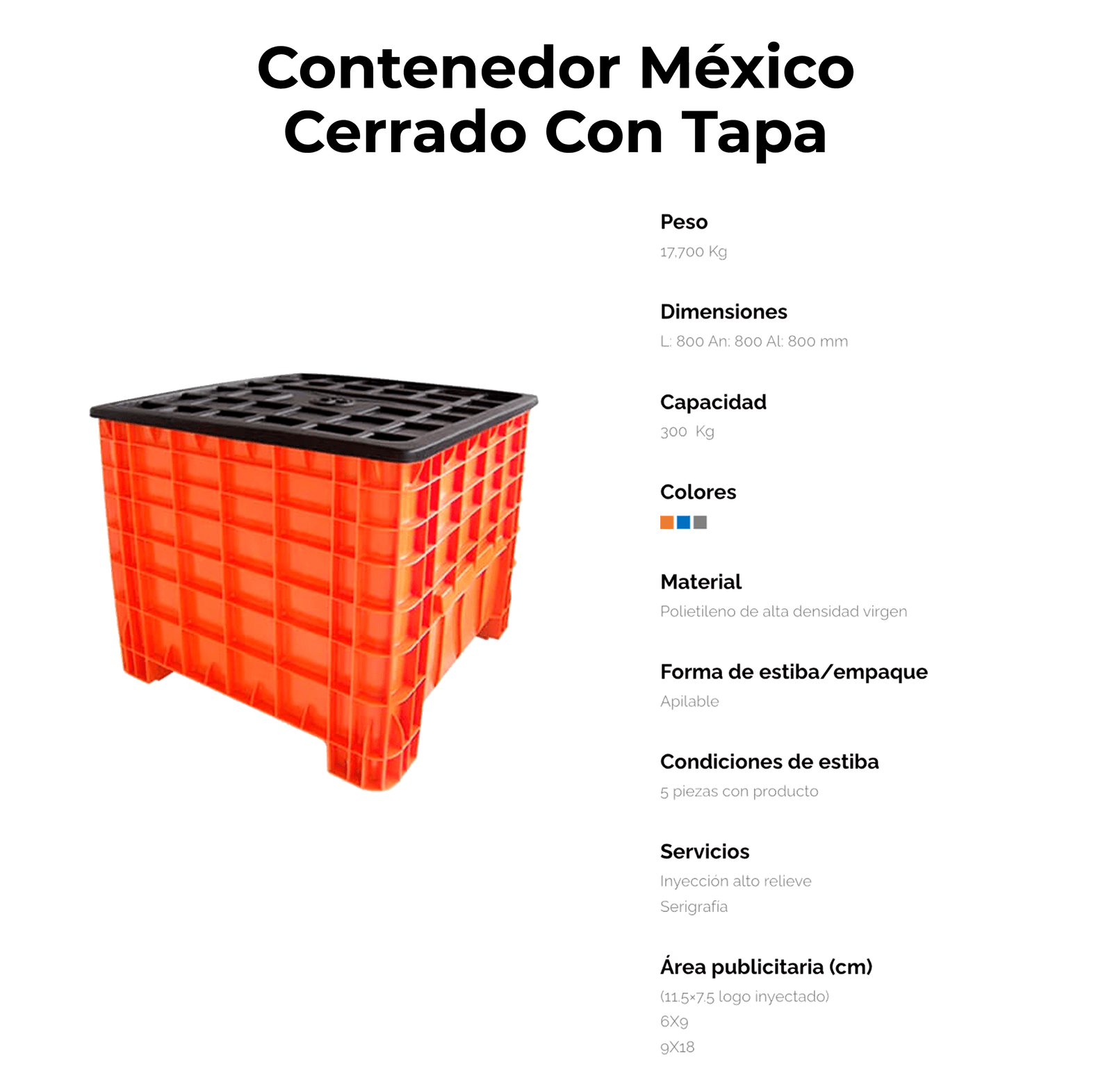 Descripción: Material: Polietileno de alta densidad virgen. Medidas: Largo: 80.0 cm. Ancho: 80.0 cm. Alto: 80.0 cm. Peso: 17.700 Kg. Capacidad: 300 Kg. Forma de estiba/empaque: Apilable. Condiciones de estiba: 5 piezas con producto. Color: Azul. Con Tapa.