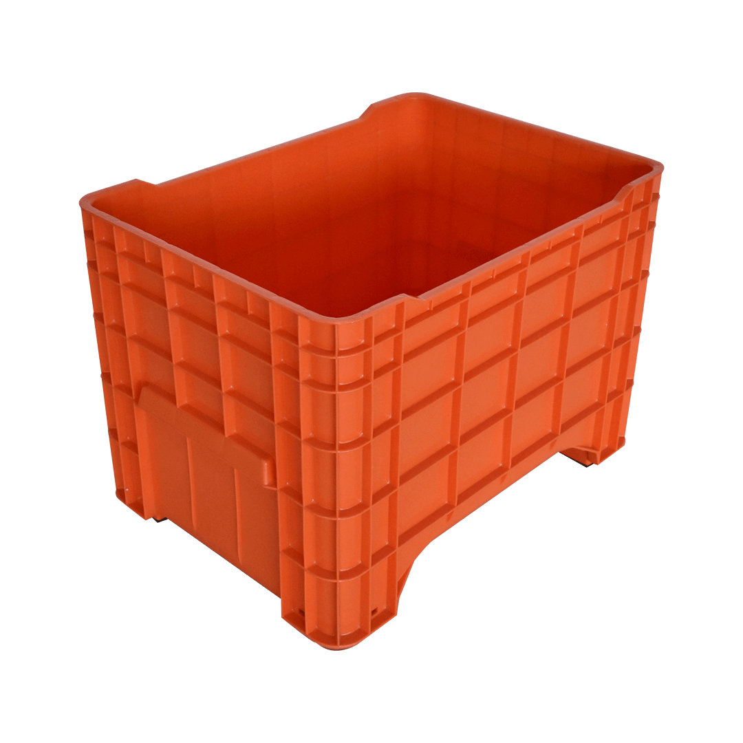 Material: Polietileno de alta densidad virgen. Medidas: Largo: 83.0 cm. Ancho: 60.0 cm. Alto: 58.0 cm. Peso: 9.720 Kg. Capacidad: 250 Kg. Forma de estiba/empaque: Apilable. Condiciones de estiba: 5 piezas con producto. Color: Naranja.