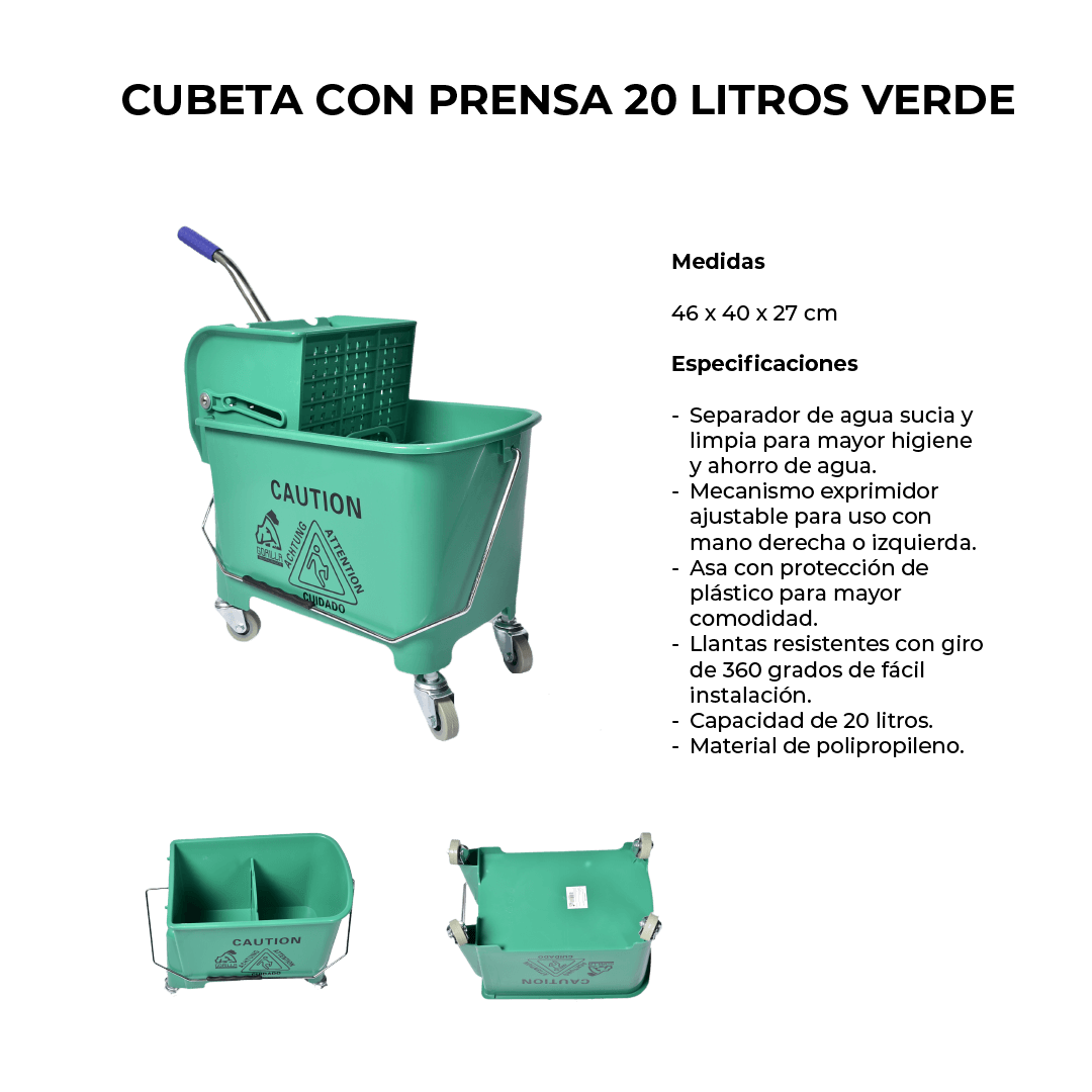 Descripción: Cubeta 20 Lts Con Prensa Y Separador De Agua. Material: Polipropileno. Medidas: 46 X 40 X 27 Cm. Color: Verde.