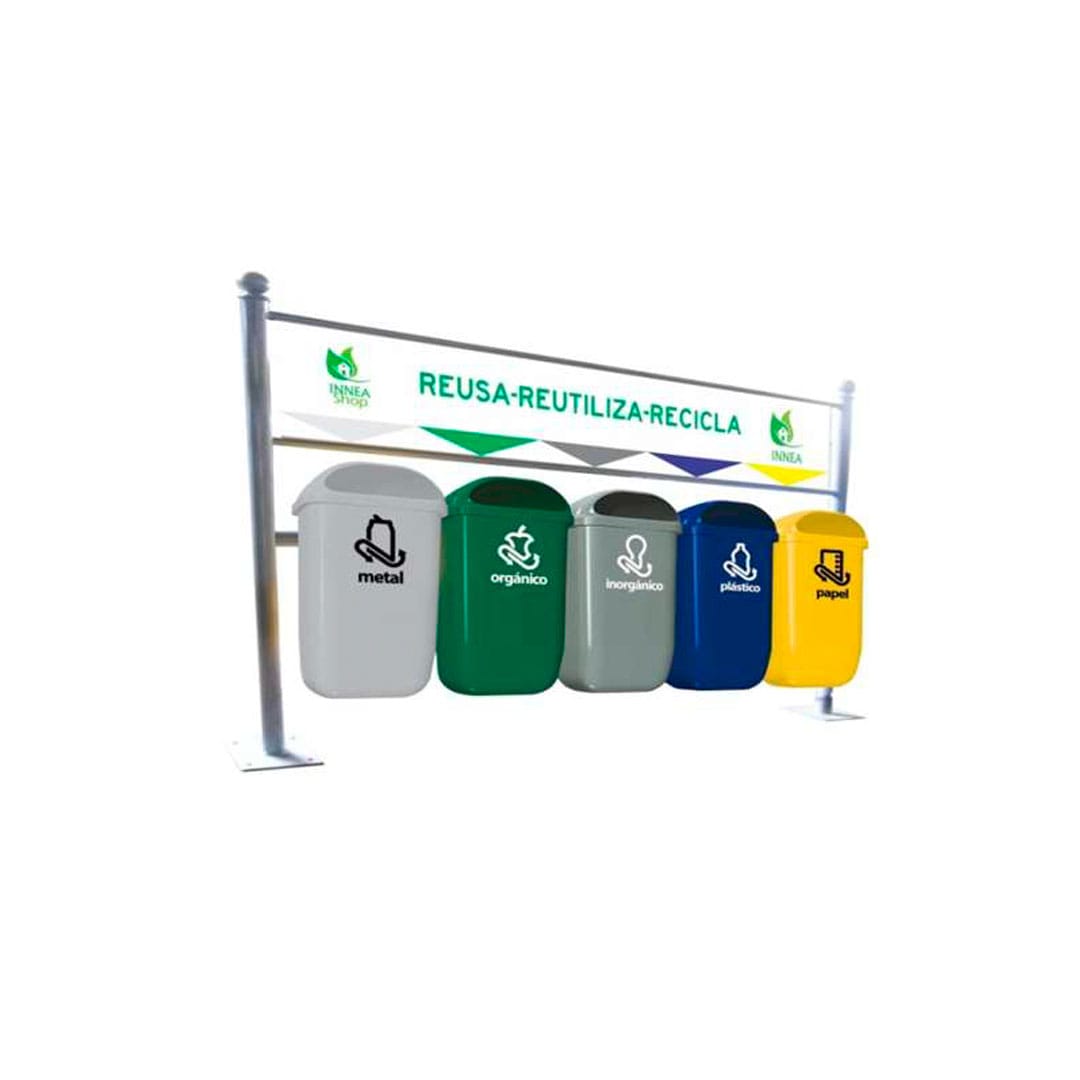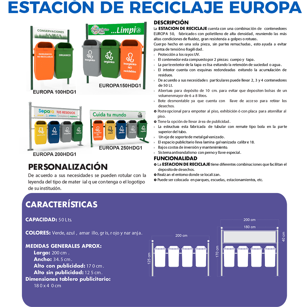 Capacidad por contenedor: 50 Lts. Color de contenedor: Verde. Color de Soporte: Gris Claro. Medidas contenedor: Largo: 39.5 cm. Ancho: 25 cm. Alto: 74.0 cm. Medidas estación: Largo: 200.0 cm. Ancho: 30.0 cm. Alto: 130.0 cm. Capacidad total de reciclaje: 250 Lts. Costo de personalización de logos y leyendas en vinil impresión Digital y vinil en contenedores de acuerdo a proyecto no incluido.