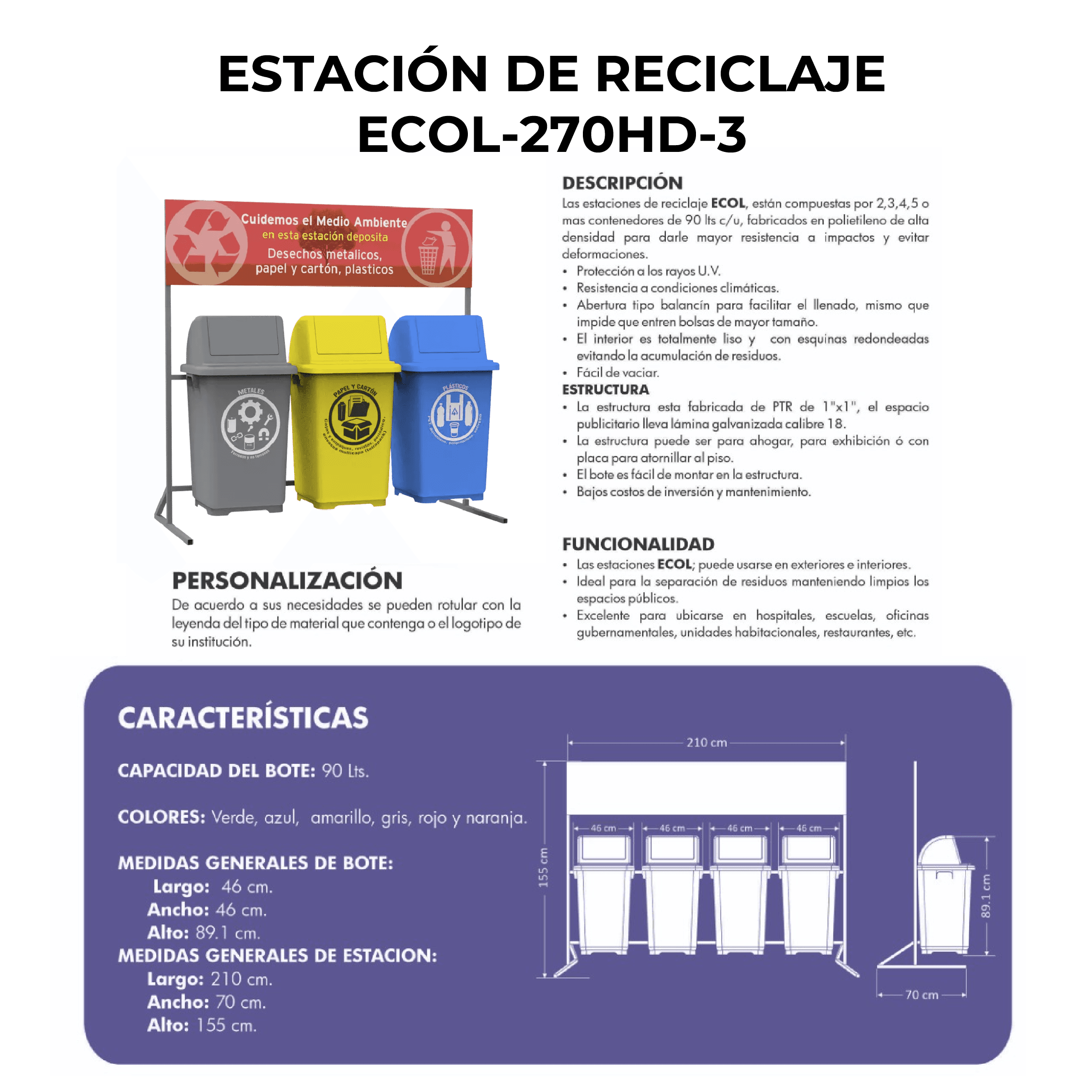 Capacidad por contenedor: 90 lts. Color: verde, gris, amarillo y azul. Medidas del contenedor: Largo: 47.0 cm. Ancho: 54.0 cm. Alto: 94.0 cm. Color de soporte: Gris claro. Medidas estación: Largo: 165.0 cm. Ancho: 78.0 cm. Alto: 148.0 cm. Capacidad total de reciclaje: 270 lts. Espacio publicitario con una cara al frente. Costo de personalización de logos y leyendas en vinil impresión Digital y vinil en contenedores de acuerdo a proyecto no incluido.