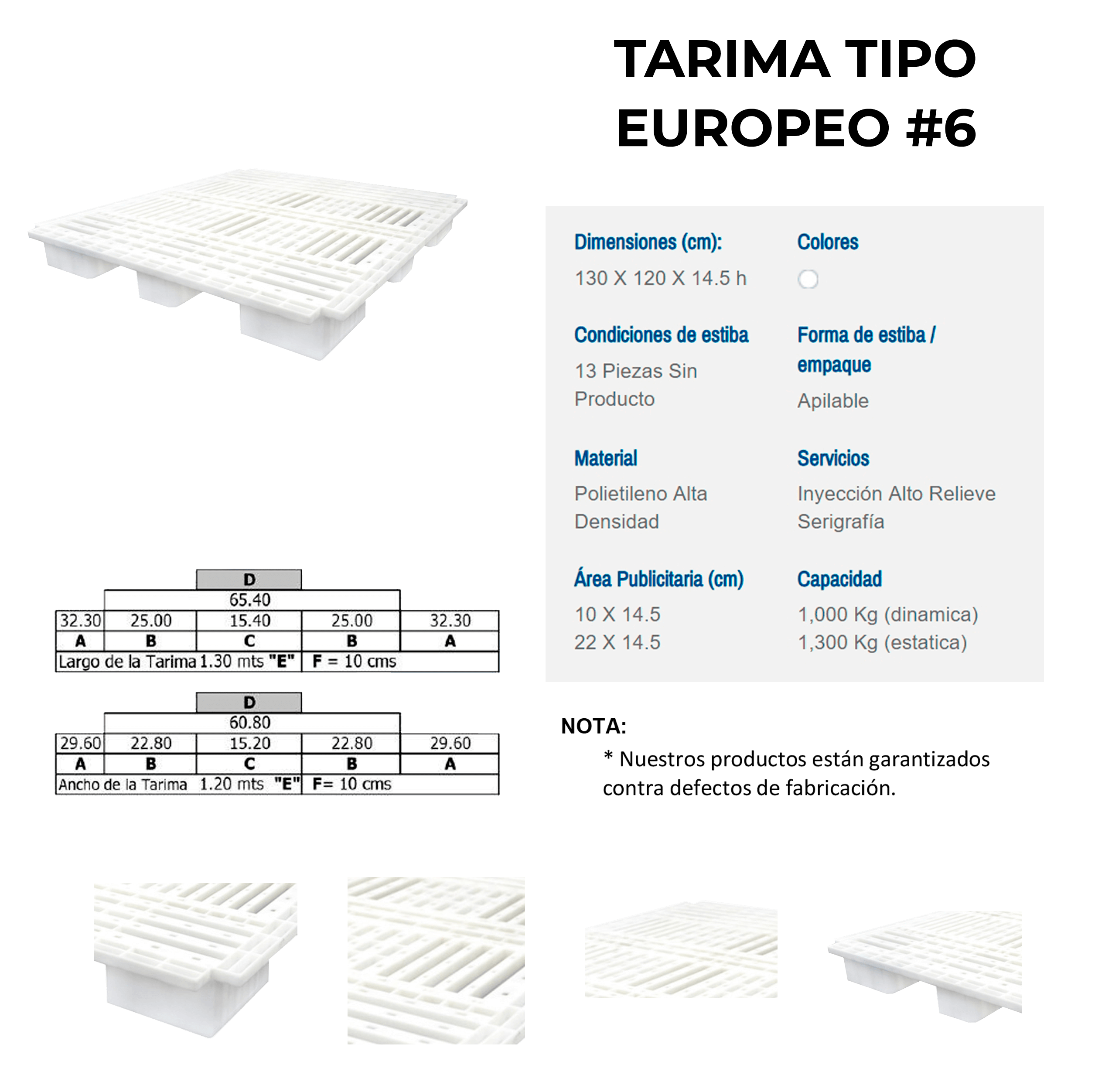 Tarima de plástico fabricada en polietileno de alta densidad virgen (HDPE). Capacidad de Carga Estática: 1,300 kg. Capacidad de Carga Dinámica: 1,000 kg. Colores: Blanco. Medidas: Largo: 130.0 cm. Ancho: 120.0 cm. Alto: 14.5 cm. Peso: 17.683 Kg. Forma de estiba/empaque: Apilable. Condiciones de estiba 13 piezas sin producto.